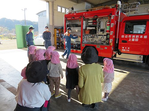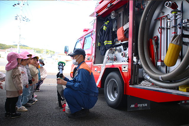 大好きな消防車、救急車が園から見えます。歩いていくとかっこいい消防士さんがサービスしてくれる事も。