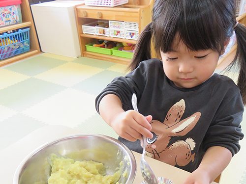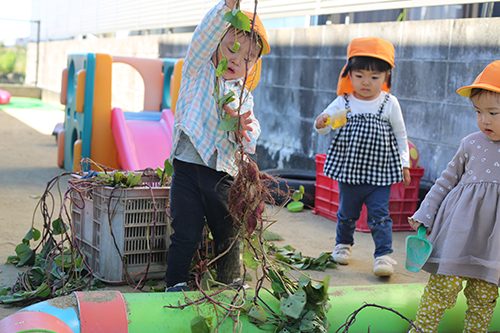 園庭の柿や、自分で植えたさつまいもを自分たちで収穫して、その日のお給食に変わることで、食べ物の本来の姿から、お皿に乗るまでの流れを知ることもできます。